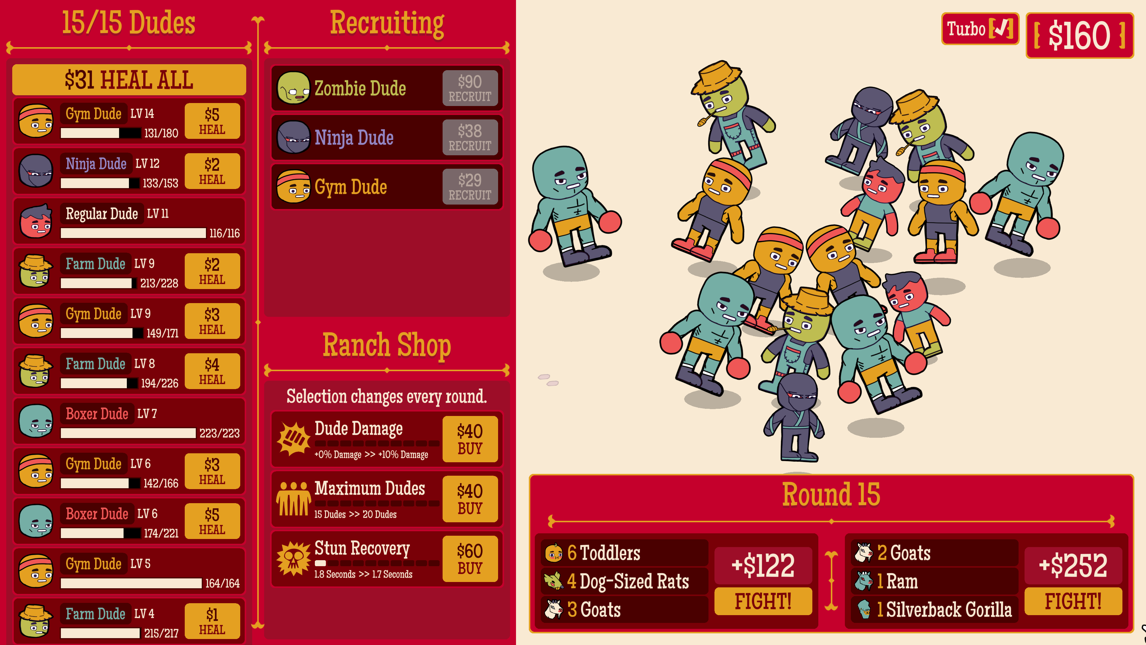 Enter the Dude Ranch, where you recruit Dudes to fight in an arena against ever escalating challenges. Improve your Ranch, manage your Dudes, and see just how many it takes to beat-up a Gorilla.